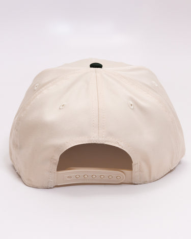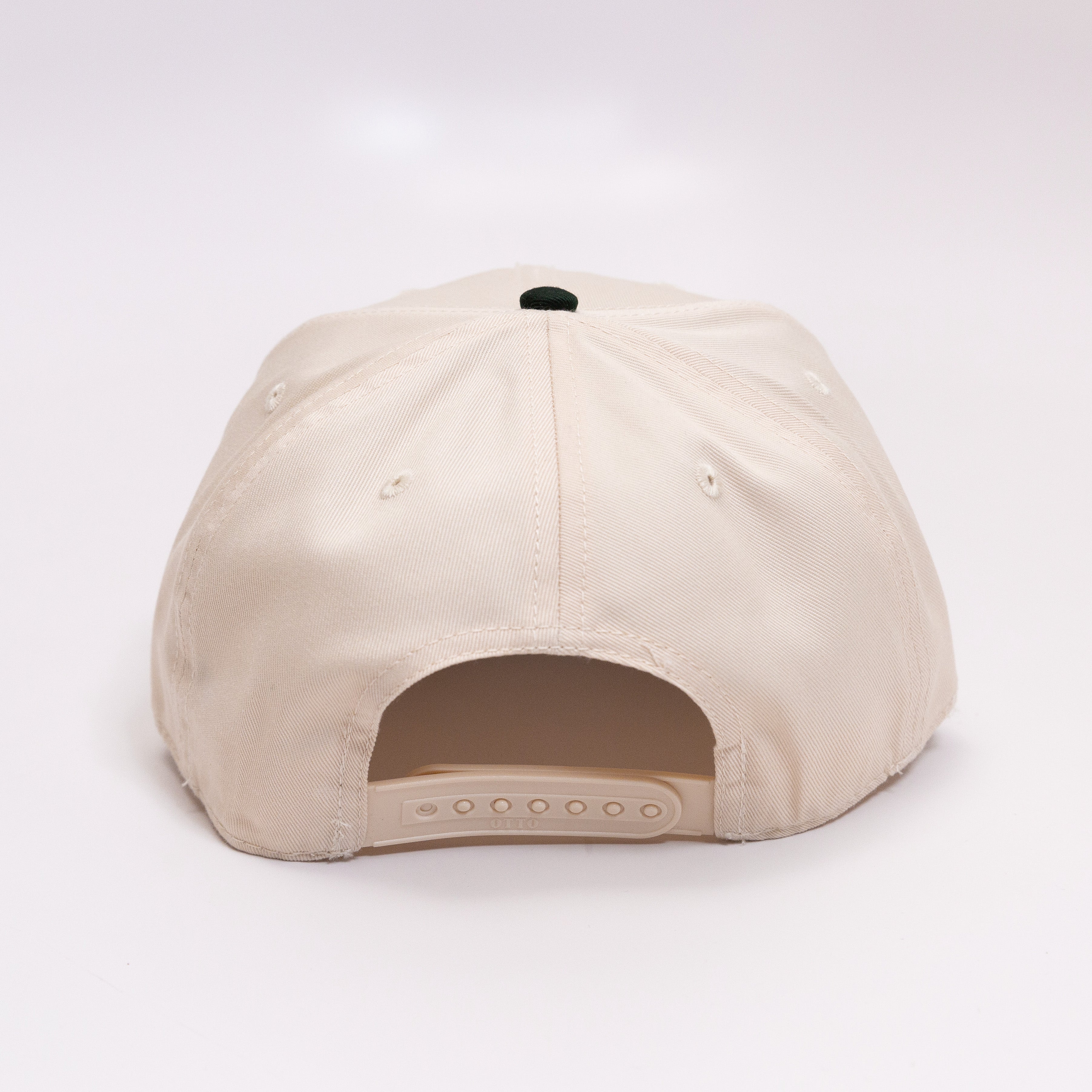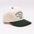 A stylish nod to the cowboy and cowgirl legacy of Carmel and Denny Ellerman and their humble beginnings in Stonyford, California. This two-toned, structured 5-panel unisex hat is crafted from premium cotton, ensuring both comfort and durability. The hat features a natural-colored crown paired with a forest green brim, creating a classic and versatile look.